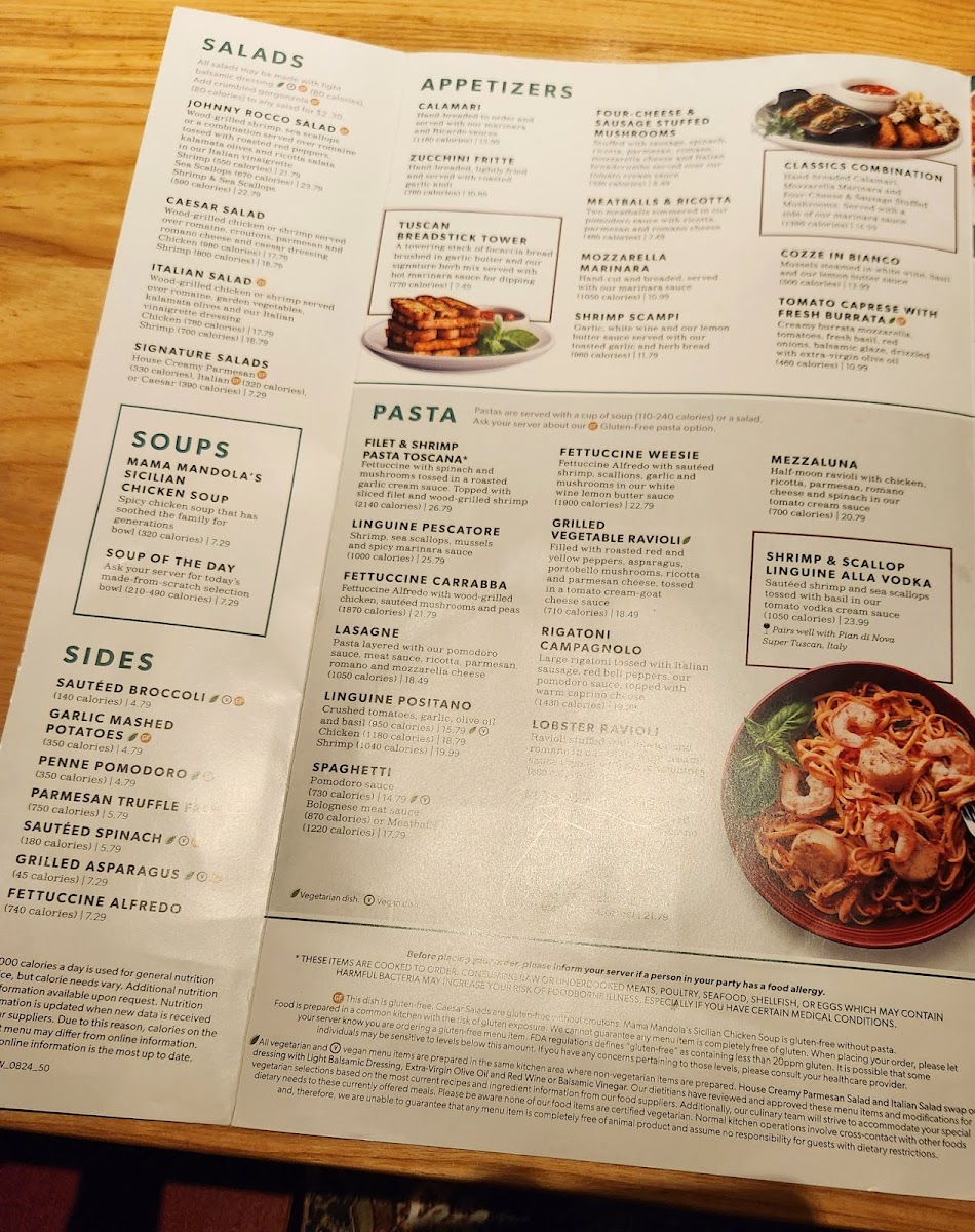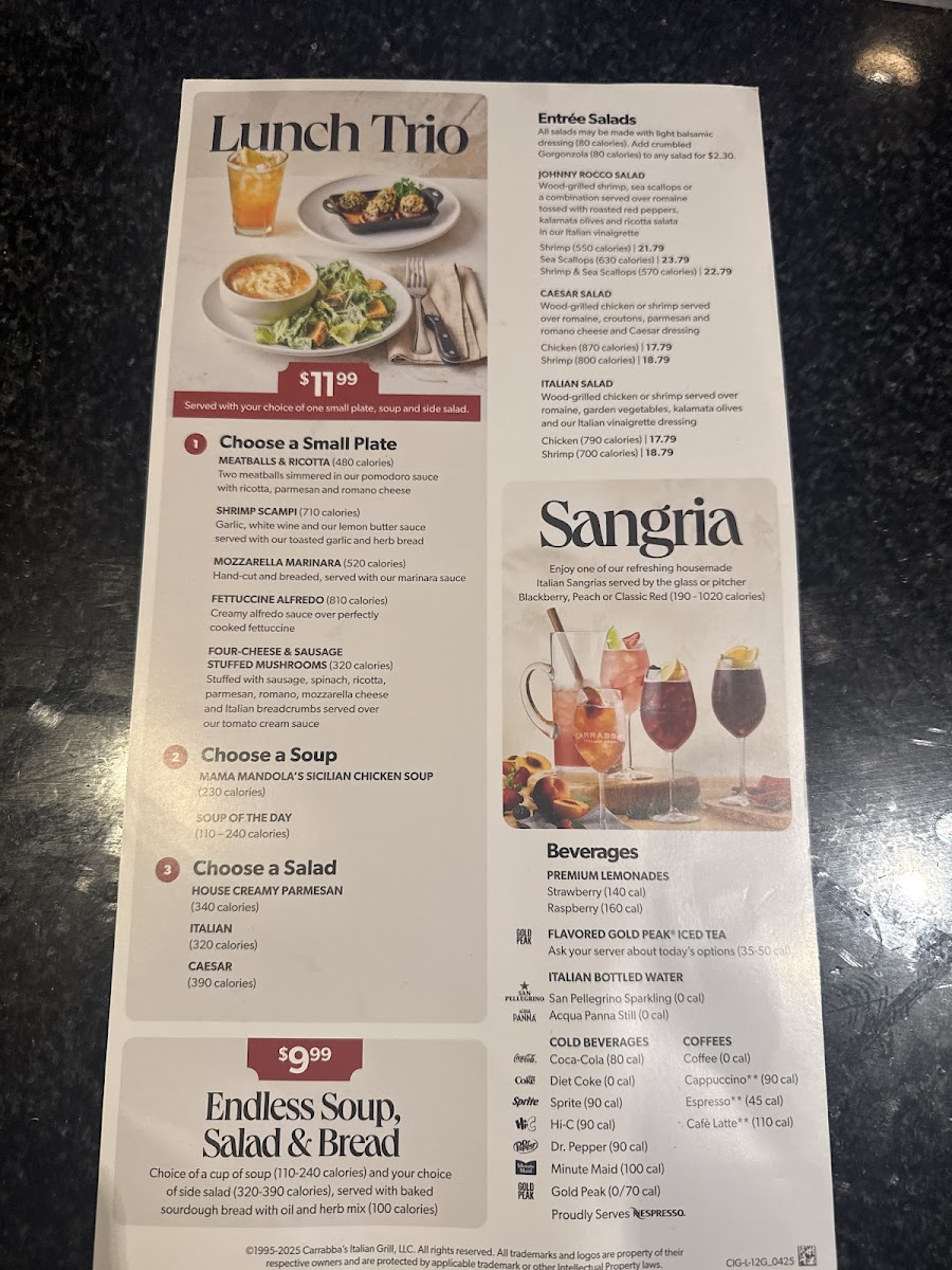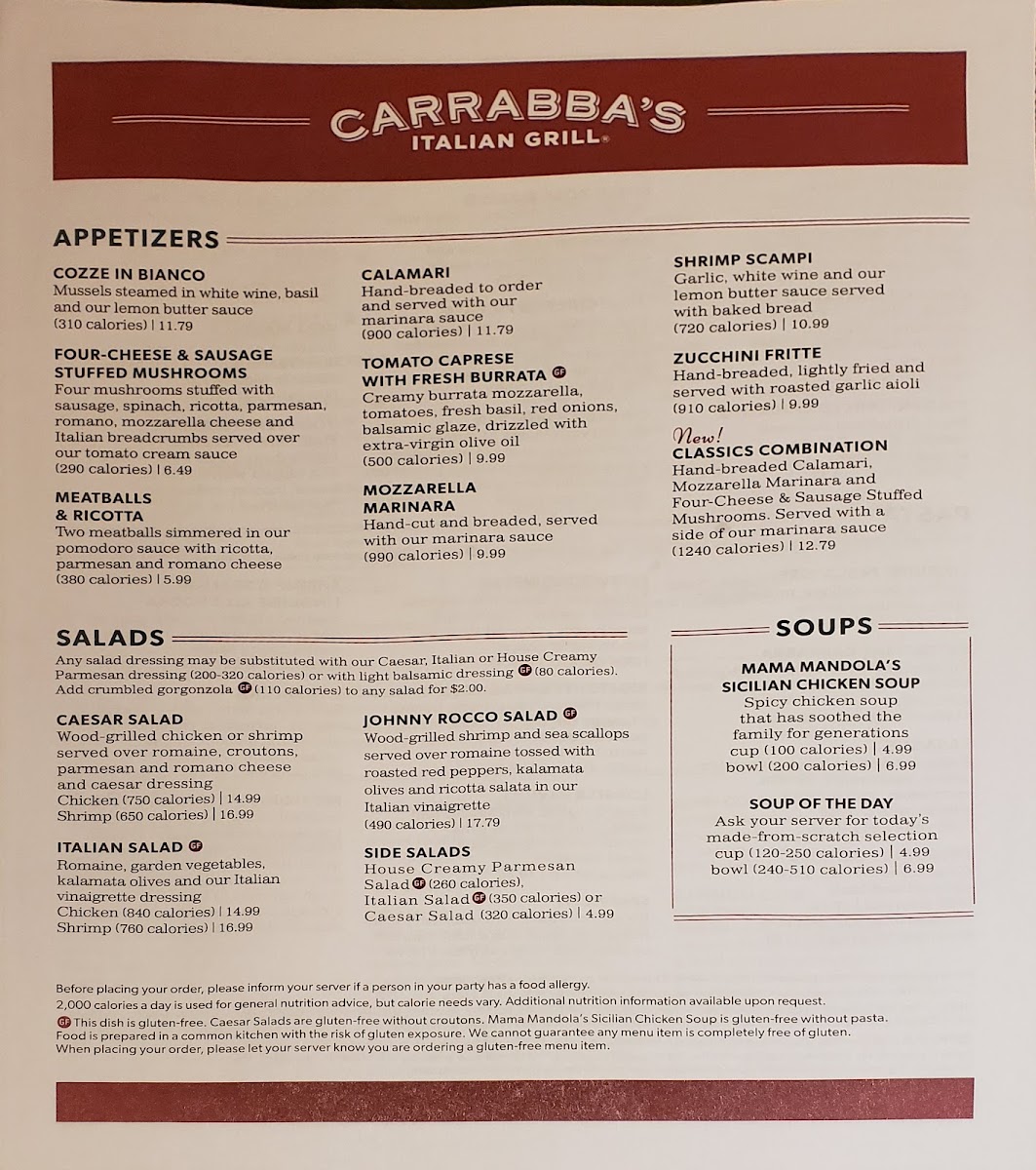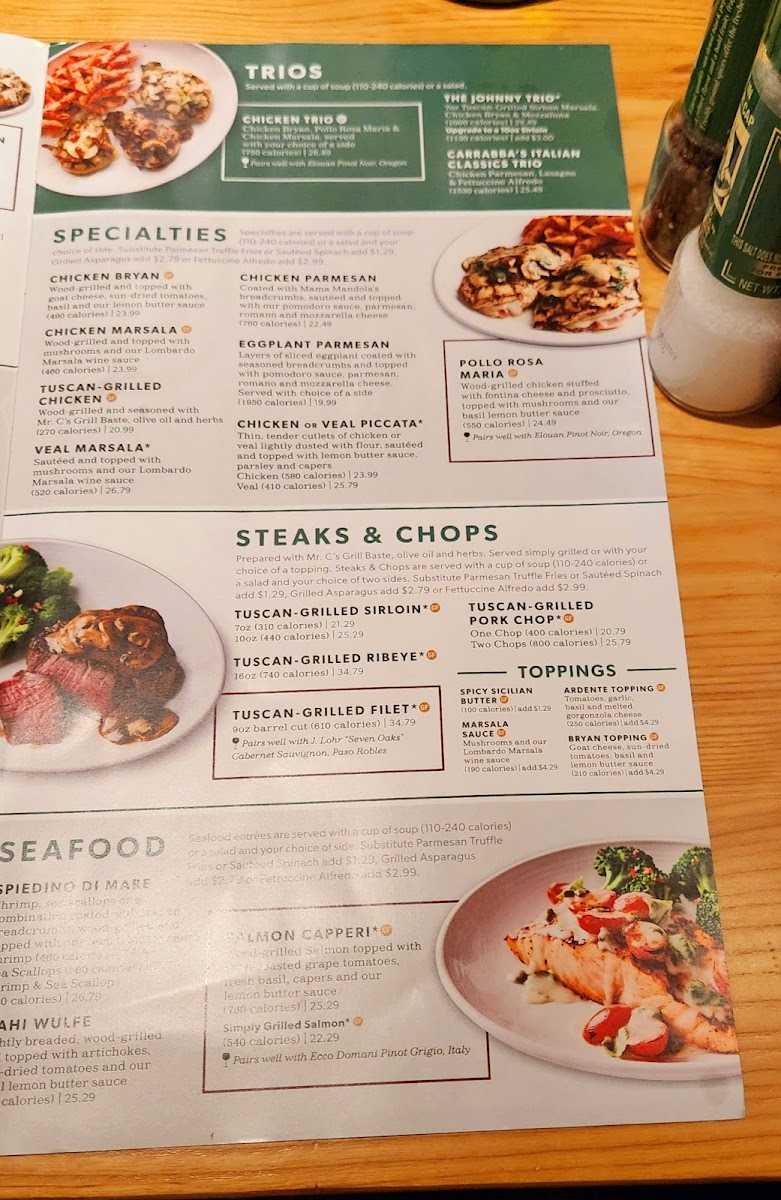 Carrabba’s Italian Grill offers a vibrant menu that beautifully marries Italian tradition with American comfort. Highlighting freshly made pasta dishes, their Filet & Shrimp Pasta Toscana stands out—fettuccine tossed in roasted garlic cream sauce, layered with spinach, mushrooms, and topped with tender filet and wood-grilled shrimp. The Linguine Pescatore impresses with a medley of shrimp, sea scallops, mussels, and a spicy marinara that ignites the palate. Classic options like the hearty Lasagne and rich Fettuccine Carrabba feature layers of pomodoro and meat sauce, with wood-grilled chicken and peas, ensuring both rustic and refined flavors.